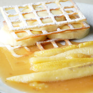 طبقات كريم بروليه مع رقائق البسكويت والموز المقفز بصلصة الكراميل