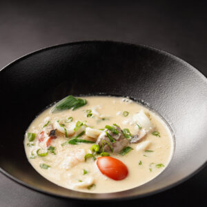 ₪48.00حبار(كلاماري)، روبيان(شريمبس)، بندورة الشيري، فقع، بصل اخضر والبراعم الصينية مع كريمة جوز الهند والكاري الأصفر.