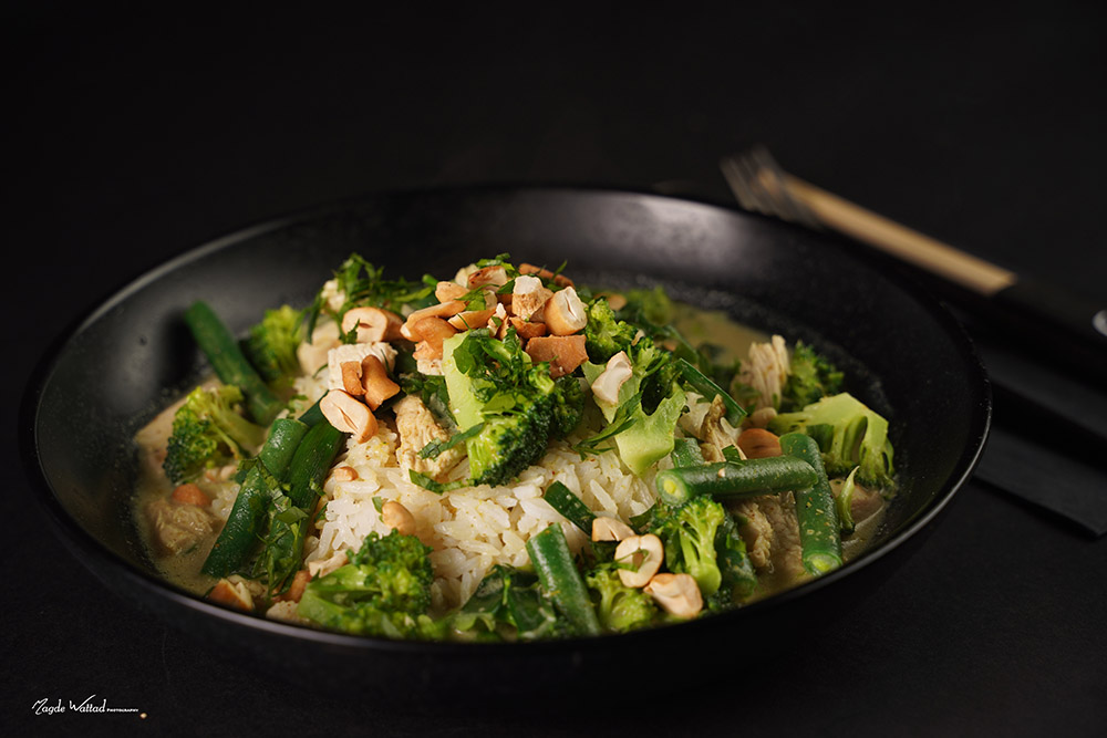 ارز ابيض، بروكلي، فاصولياء خضراء وقطع فيليه دجاج مع الكاشو المحمص بصلصه كريم جوز الهند والكاري الأصفر