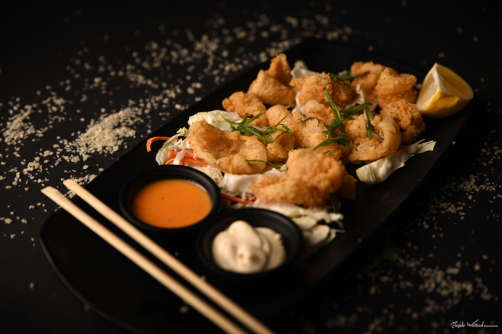 الروبيان المغطى بالطمبورا مع صلصة الفلفل الحامض وأيولي طُوغُاراشي