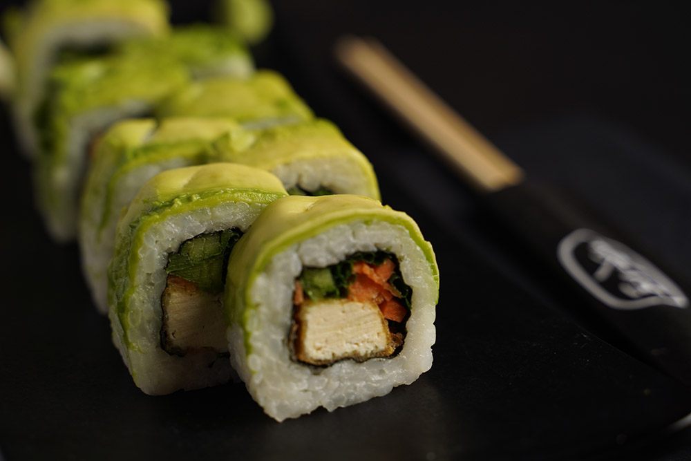 رول inside out مغطى بالأفوكادو مع طوفو طامبورا، جزر وخيار اخضر