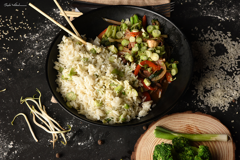 أرز أبيض، بصل أخضر، جزر، براعم صينية، بصل أبيض، بروكلي وقطع صدر دجاج مشويه بصلصة الترياكي (صدر دجاج/ سينتا عجل/ روبيان-شريمبس)
