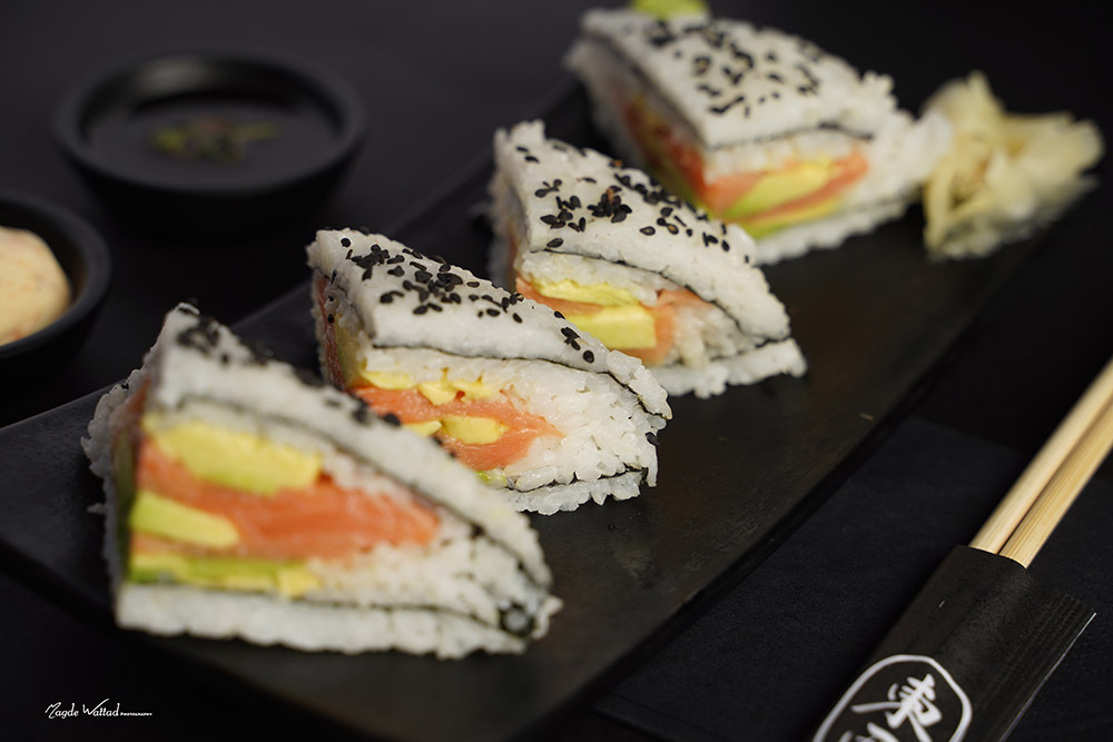اربعه ساندويشات سوشي بشكل مثلث مع سلمون/ تونة حمراء/ خلطه السبايسي تونة وأفوكادو