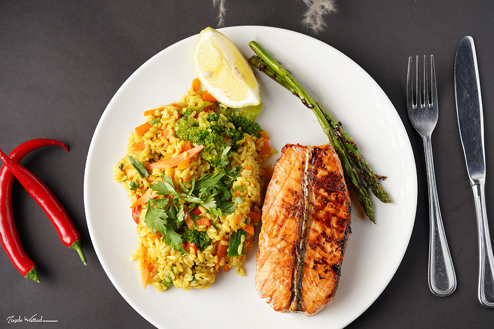 ستيك سلمون مشوي وارز مقفز مع بصل ابيض، بصل اخضر، جزر وبروكلي بصلصه كاري اصفر حامضه