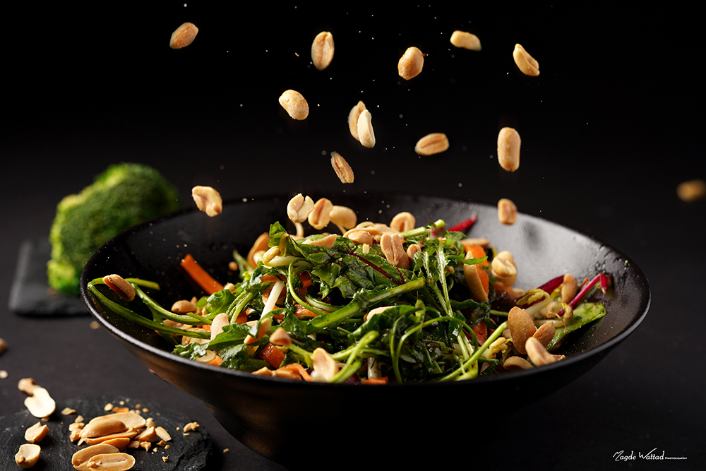 اوراق خضراء، خيار أخضر براعم صينية، جزر، بروكلي، وفاصولياء خضراء مع الفستق المقلي بصلصة الصويا، زيت سمسم، والبصل