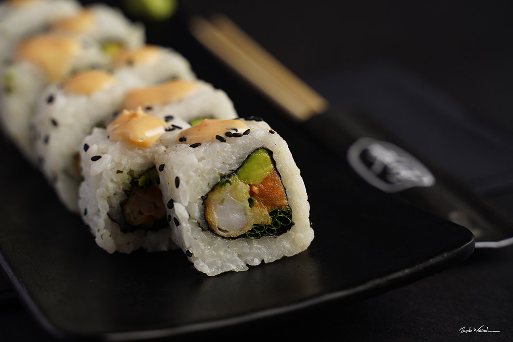 رول نباتي مغطى بالأفوكادو، رول مغطى بالسلمون/ بالتونة الحمراء، ساندويش سوشي، رول مقلي، رول سلمون/ تونة حمراء وقطعتين نيجيري سلمون وتونة حمراء