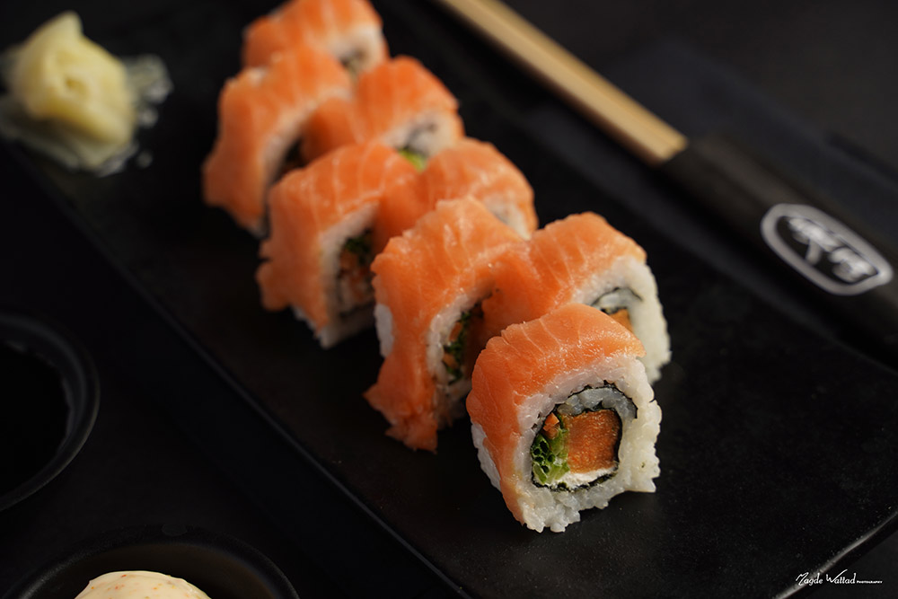 رول inside out مغطى بالسلمون مع بطاطا حلوة , بصل أخضر وجبنة الفيلا دلفيا