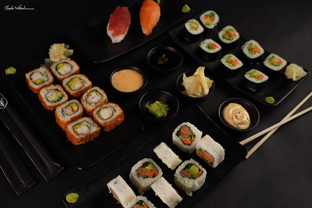 رول مع سلمون، رول نباتي، رول مقلي مع الروبيان بالطمبورا (شريمبس) وقطعتين نيجيري سلمون وتونة حمراء