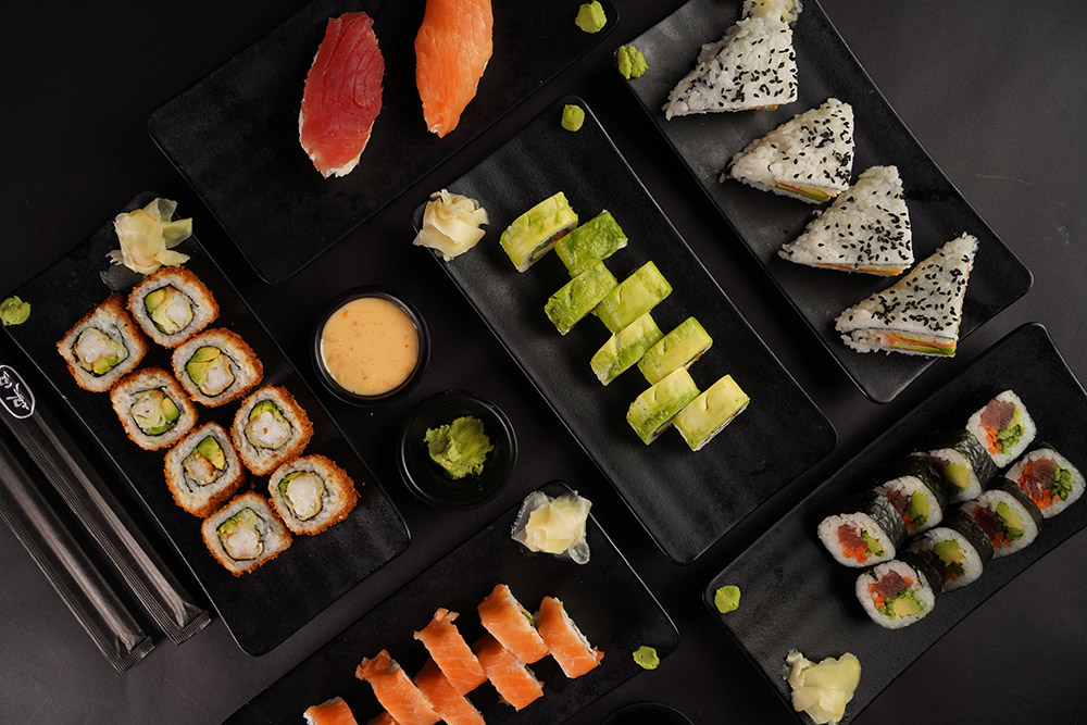 رول نباتي مغطى بالأفوكادو، رول مغطى بالسلمون/ بالتونة الحمراء، ساندويش سوشي، رول مقلي، رول سلمون/ تونة حمراء وقطعتين نيجيري سلمون وتونة حمراء