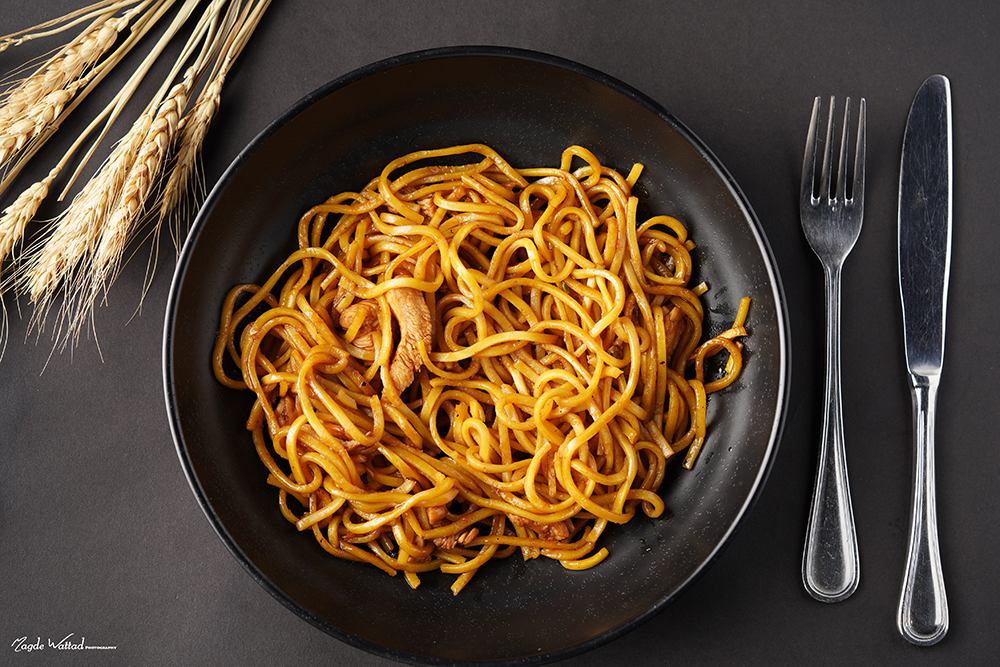 نودلز مع قطع صدر دجاج مشوي بصلصة الترياكي