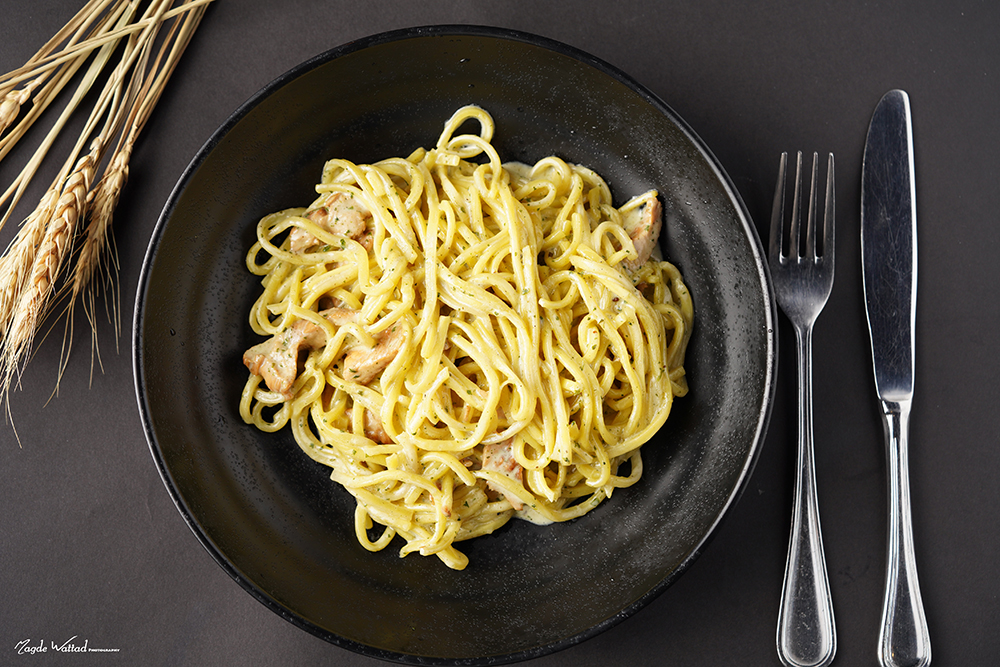 نودلز مع قطع صدر دجاج مشوي بصلصة الكريم والبيستو